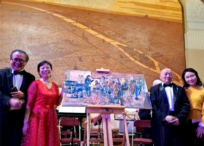 巴黎 15区区长 Philippe GOUJON 菲利普.顾戎 先生出席音乐会并发表中国马年新年致辞,马来西亚侨民协会前任会长叶俊聪先生代表华人用双语致辞。旅法艺术家沈斯先生,现场作画